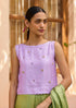 The Awakening Blouse is crafted in handwoven mulberry silk and features scallop cutwork across the edges. Along with the soothing hue, this lavender blouse features hand-beaded flower motifs on the front, adding a touch of delicate charm and artisanal craftsmanship to the ensemble.