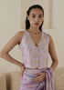 The Sisterhood Sonnet blouse features a hand-drawn pansy floral print and a silhouette inspired by a waistcoat. It is crafted in the softest handwoven mulberry silk.