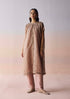 Handwoven in Kota silk, the kurta features a center-front buttoned opening with light gathers at the shoulders that soften its structure. A silk modal slip inside adds comfort, while straight pants in a muted blush hue provide a gentle contrast, completing the set with understated harmony.