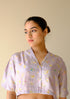 This Sisterhood Sonnet blouse features a hand-drawn pansy floral print in a shirt blouse silhouette. It is crafted in the softest handwoven mulberry silk.