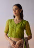 Handwoven in organza silk, the blouse is fully adorned with cutwork floral embroidery, subtly highlighted with luminous beads that catch the light with gentle shimmer. Puffed sleeves lend a romantic silhouette, while scalloped embroidery traces the neckline, center front, and sleeve hems with refined elegance.